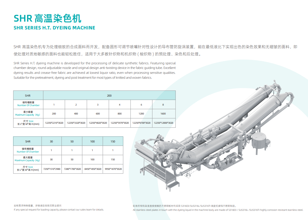 產(chǎn)品簡介:SHQ 是一臺適用性廣泛,可生產(chǎn)市場上絕大多數(shù)面料,特別在化纖染色時有很好效果的管式下行染色機,染色浴比 1:5-12 節(jié)能減排。低機臺設計減小織物張力,染 色后縮率小,無折痕,